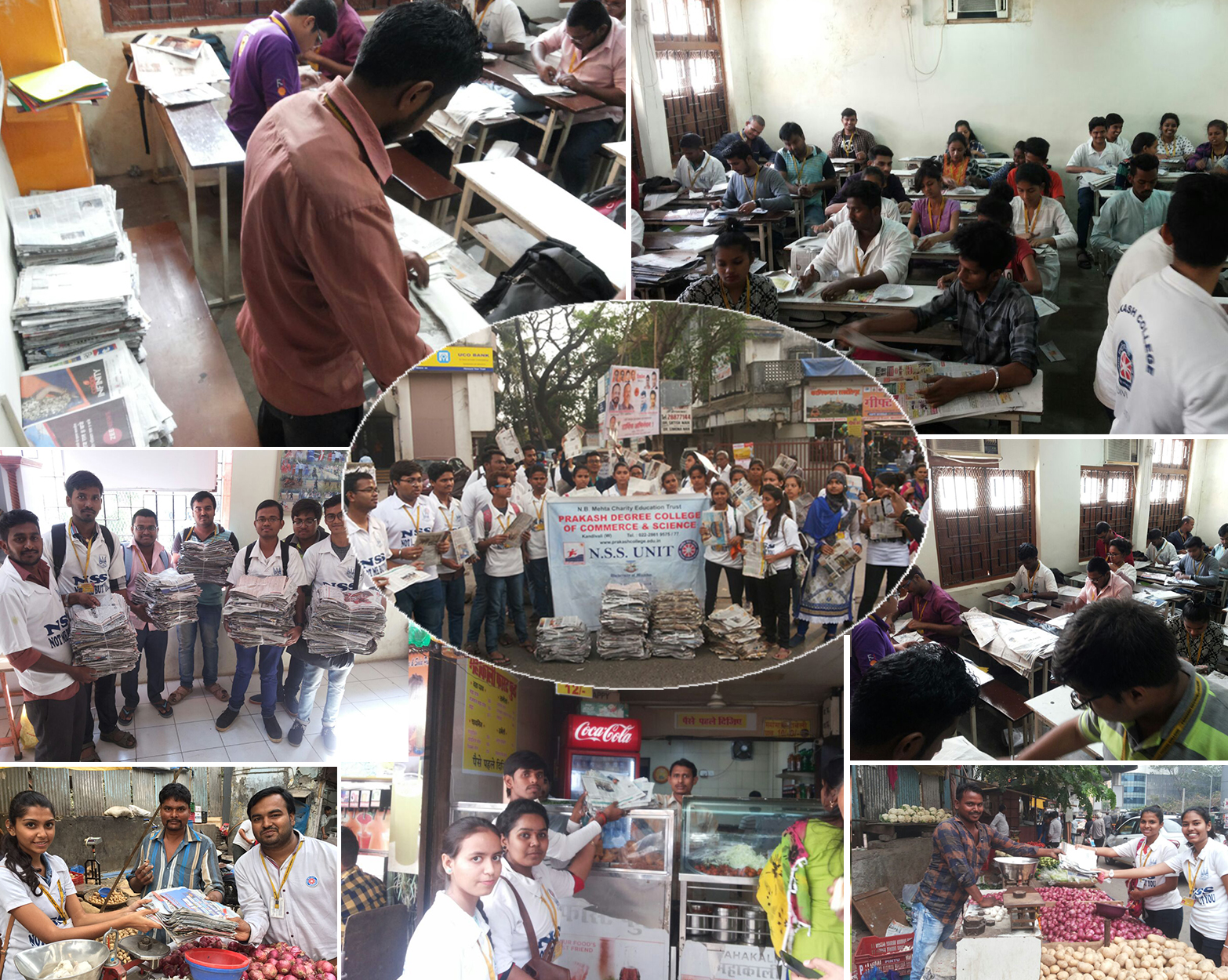 Prakash Degree College NSS Unit volunteers collected newspapers for an entire year from their homes, total newspapers weighing 25 kgs. Was accumulated and on 3rd February 2018 from morning 7 a.m to 3 p.m students prepared 10,000 paper bags for distribution to venders.